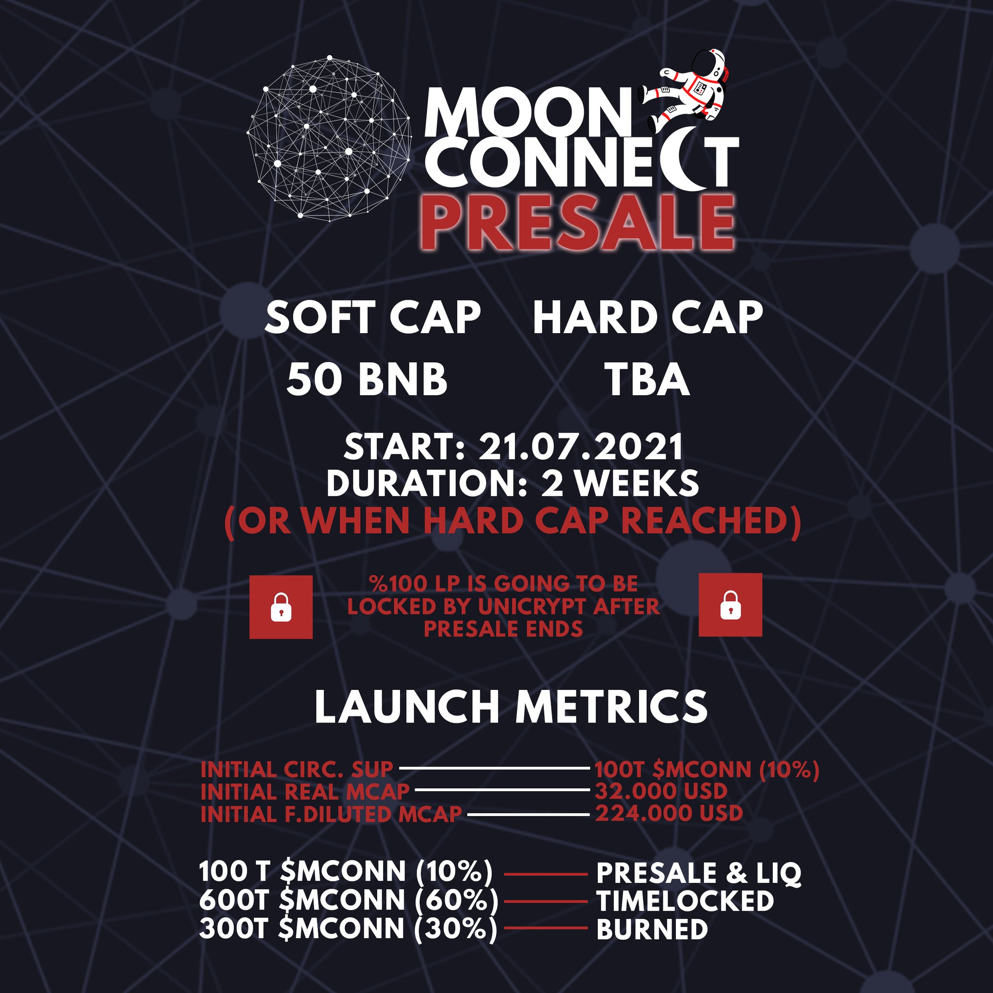 Moonconnect aims to become the most decentralized and fairly distributed token in the universe by reaching at least 5.000.000 holders! More than 70% of the circulating supply will be sent through random Airdrops, Bounties and Rewards.